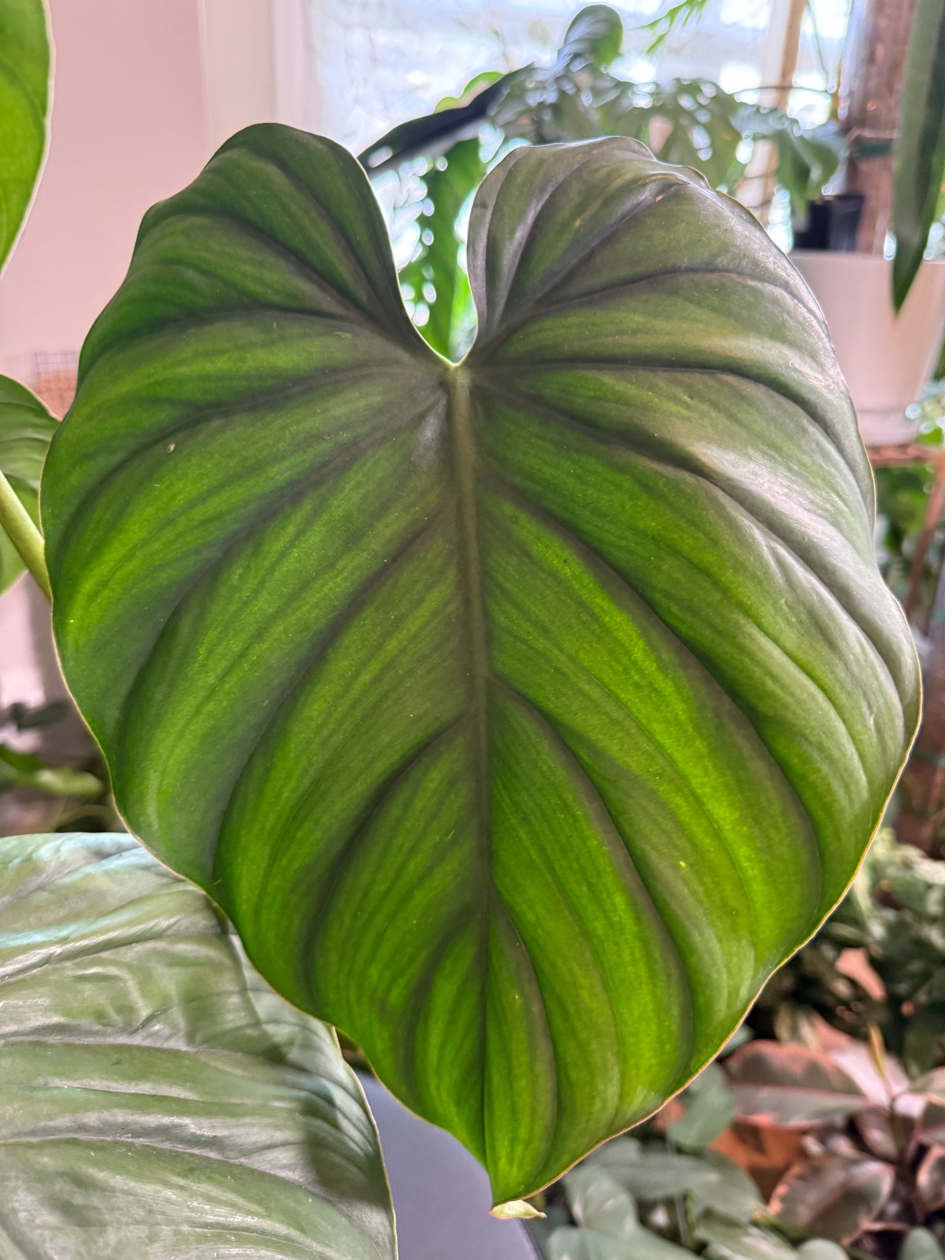 Philodendron Columbia for sale – rare climbing aroid with large velvety green leaves and bold veining.